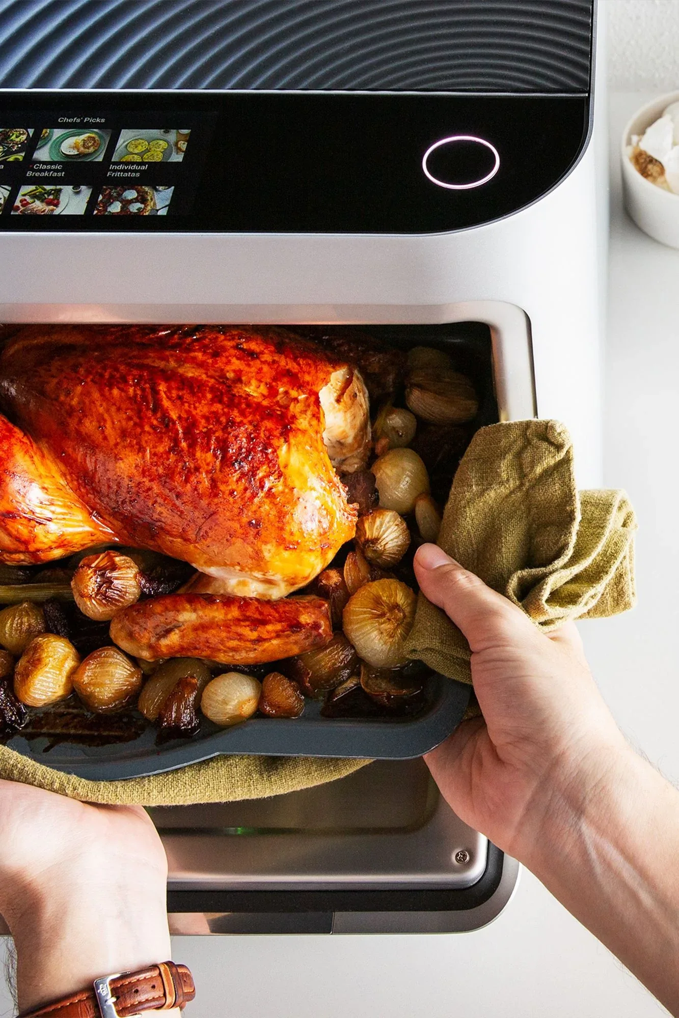 If you aren't familiar, it's kind of like bringing a personal chef into your kitchen. It has many thousands of built-in recipes. It cooks with focused infrared light in six different zones, controlled by some fancy software and orchestrated by Brava chefs. With the unique power control system Brava is able to exactly replicate recipes no matter the voltage available in your house. Did you know some houses in the US only have 110V and some have 125V? Cooking appliances don't typically account for that difference.